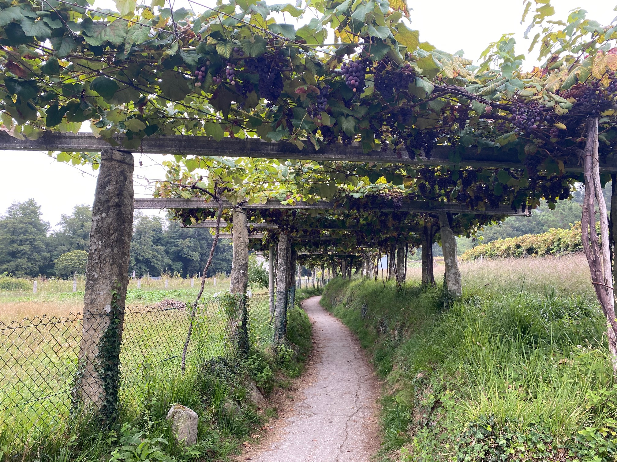 [Jesus said:]”The kingdom of heaven is like a master of a house who went out early in the morning to hire laborers for his vineyard” (Matthew 20:1). (Photo by DCR. 8/28/23 of a vineyard we walked under on our last day on the Camino to Santiago de Compostela, Spain.)