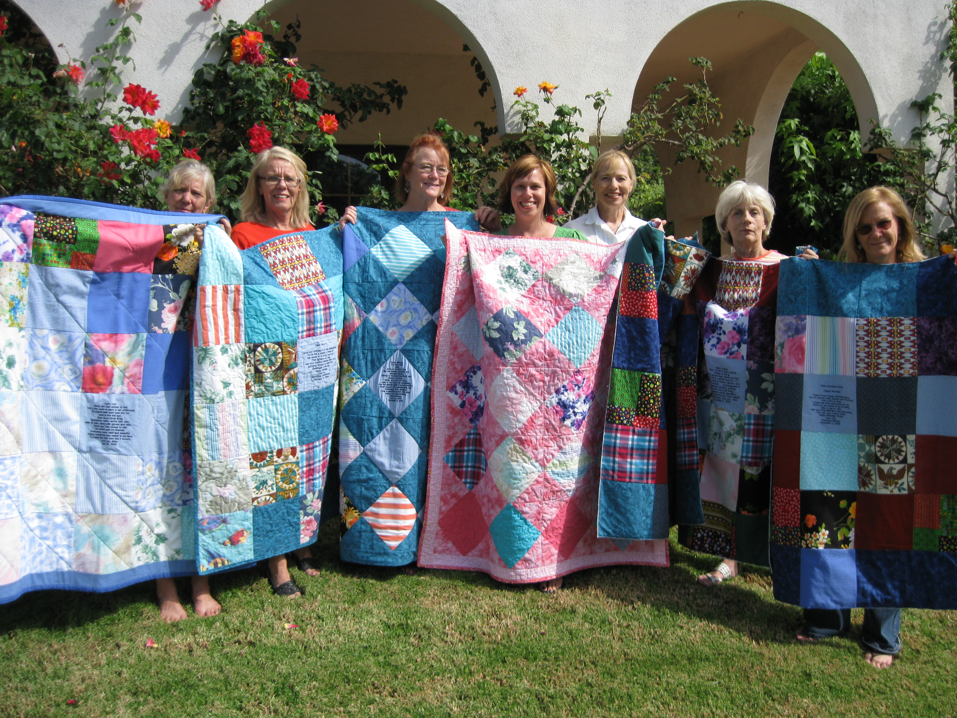 On Sunday afternoon we all lined up in our yard to take a photo of us holding up seven mostly finished quilts made from Mom’s clothes—the Grandma quilts. Soon the exhausted quilters were all on the road to somewhere with their precious bundles of quilts.